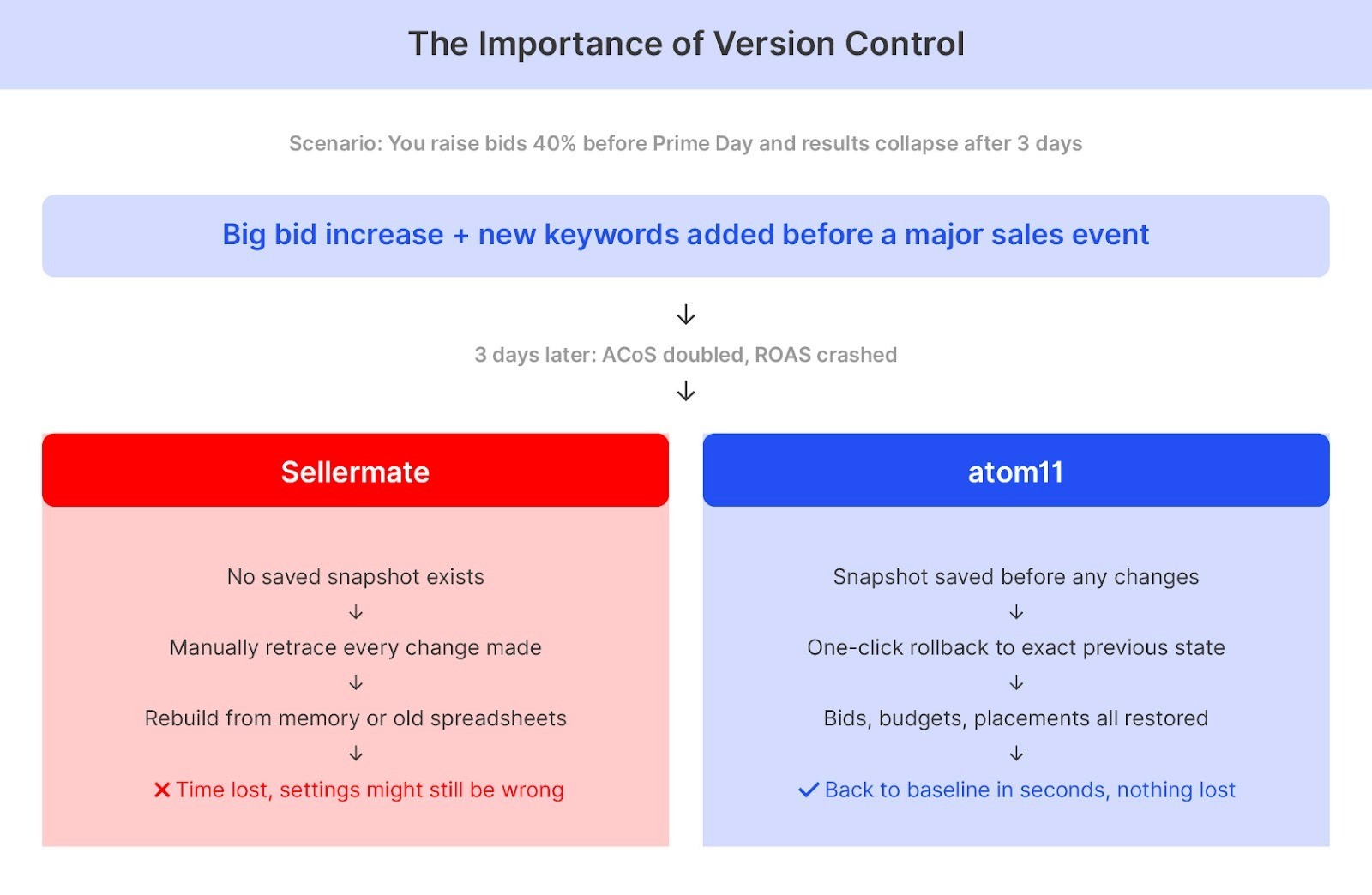 No. Sellermate provides action logs showing what changes were made, but there is no snapshot or rollback system. If a bid strategy backfires, you manually retrace every change without a guaranteed restore point.